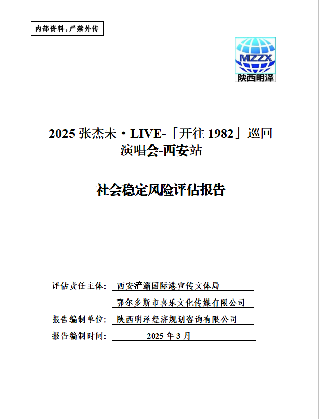 本报告主要对2025张杰未·LIVE-「开往1982」巡回演唱会-西安站活动进行社会稳定风险评估,该演唱会拟于2025年8月29日-8月31日在西安市奥体中心体育场举办,单场预计总费用为1795万元,预计演出时长210分钟,意向观众单场约35000人(以实际为准),该活动主管部门为西安浐灞国际港宣传文体局,由鄂尔多斯市喜乐文化传媒有限公司负责策划及运营。