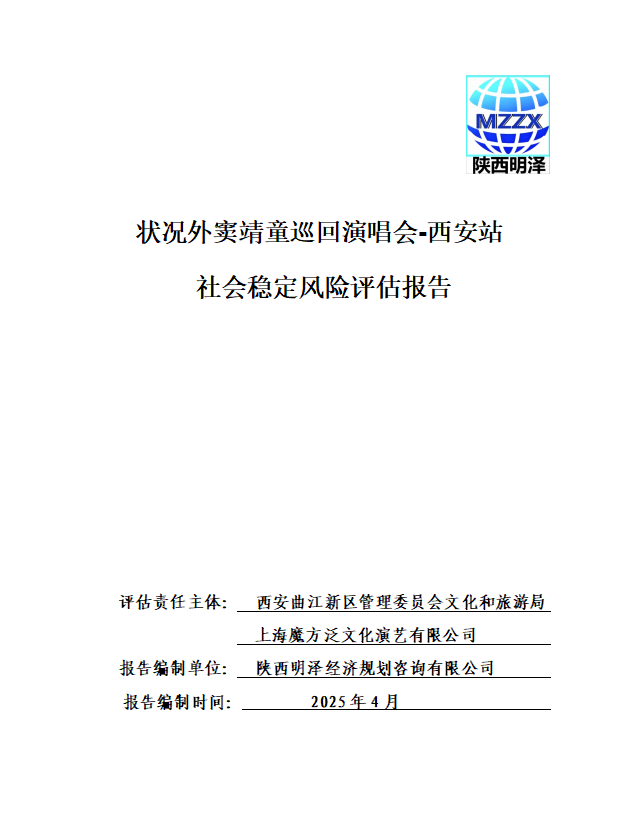 本报告主要对状况外窦靖童巡回演唱会-西安站活动进行社会稳定风险评估,该演唱会拟于2025年8月23日19:30-22:00在西安曲江竞技中心举办,预计总费用为360万元,预计演出时长150分钟,拟销售门票4800张(以实际为准),该活动主管部门为西安曲江新区管理委员会文化和旅游局,由上海魔方泛文化演艺有限公司负责策划及运营。