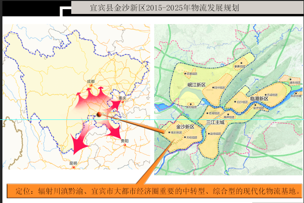 一心:以城北为核心,重点发展商贸物流,建成立足宜宾辐射周边地区的一级区域性商贸物流中心。打造成集日用品、汽车及汽车服务、医药产品、家居建材等产品为主导的现代化大型物流集散中心。